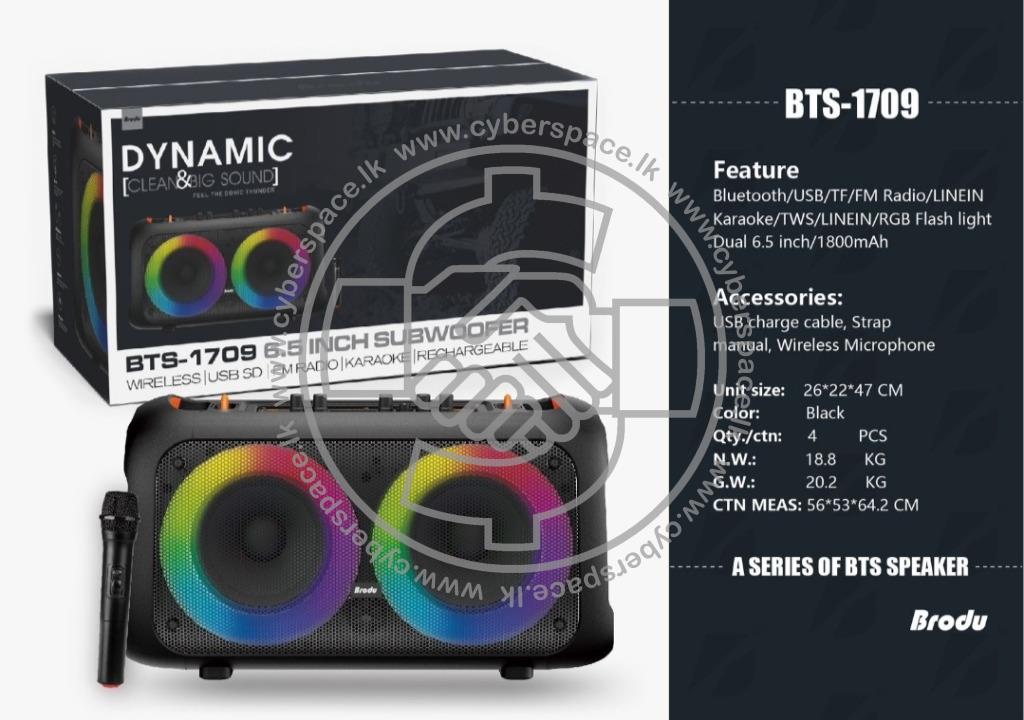 Brand: BRODU · Model: BTS-1709 · Speaker Size: Dual 6.5-inch woofers · Output Power: 60W (30W x 2) · Battery Capacity: 1800mAh · Frequency Response: 100Hz – 20KHz ...
