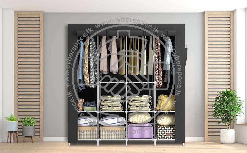 Creative design: L shape cabinet Eco-friendly Products Roll-up door for easy opening & closing For Greater Storage Space Light Weight & Portable Can Store Clothes hats & scarfs Fit Most Clothes & dresses Easy to Assemble & Disassemble High-Quality Connectors for long-term using Strong Metal Pipes Easy to Fold and Store when not in use