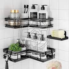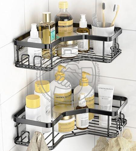 LLARGE CAPACITY: Sakugi shower racks for inside shower come with 2 L-shaped shower caddies (measure respectively 9.4"x9.4"x2.4" and 8.7"x8.7"x2.4"), a soap holder, and 4 removable hooks. These components collectively accommodate a variety of your shower necessities—approximately 15 pieces. Your shower gels, conditioners, scrubbers, and grooming tools can all be neatly arranged on the black shower caddy, all easily accessible!