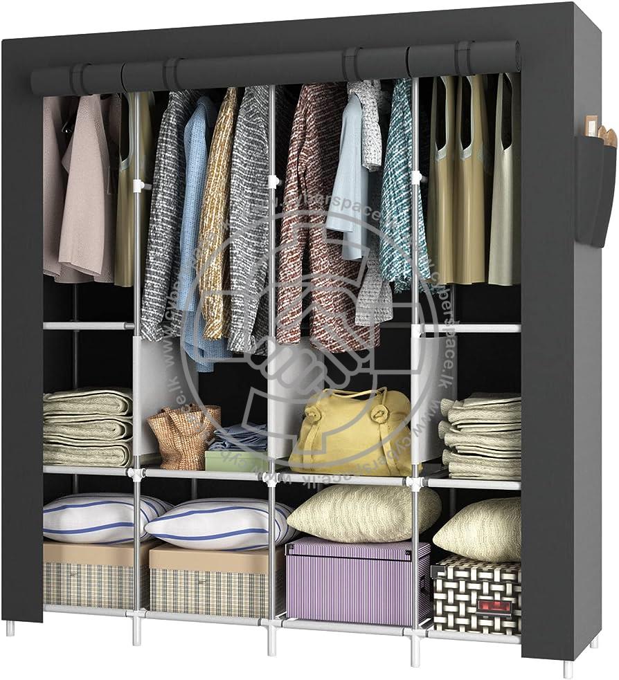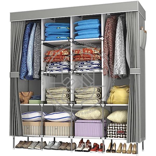 INCLUDED COMPONENTS: 4-Door Folding Wardrobe for Clothes with Sturdy & Durable Steel Coated Metal Pipes Frame; Corrosion-free Metal Components and High-Quality Plastic Components & Non-Woven Compartments and Cover